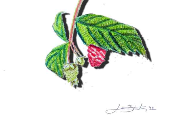 One day I was sitting at Innisfree Farm, meditating, absorbing the medicine of raspberry after a hard week. This raspberry spoke to me and said “Draw me.” So it posed nicely for me, and I captured its essence with watercolor pencil crayon. You’d be surprised how hard it is to capture the leaves accurately.